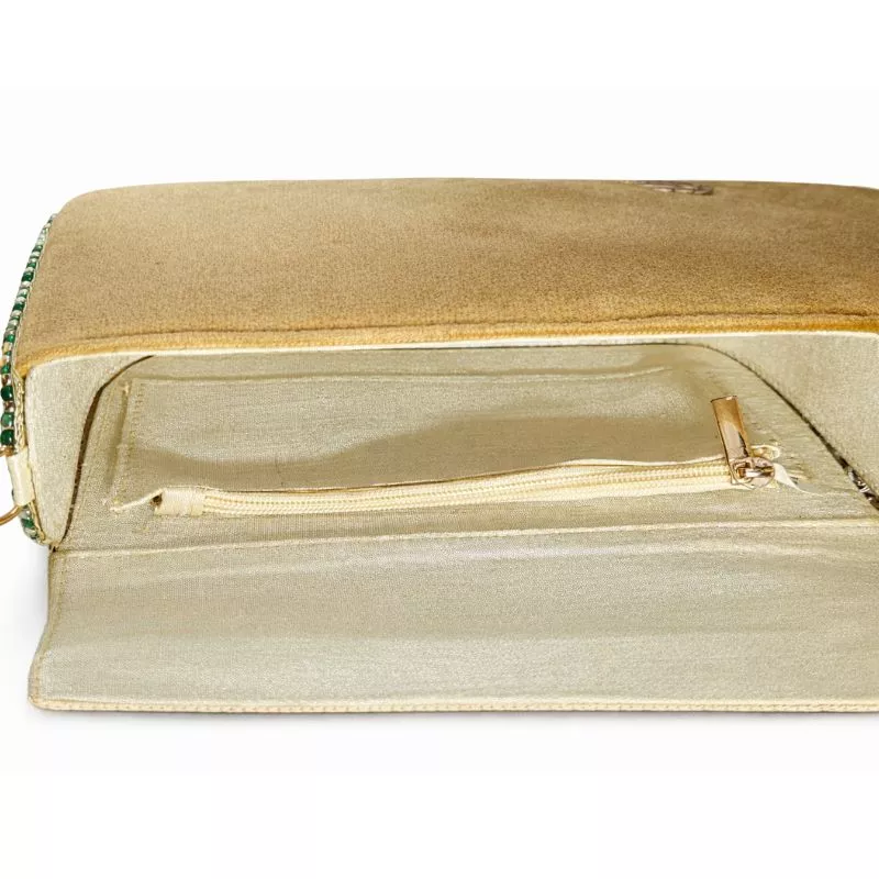 Crafted on a premium fabric base and detailed with heavy hand beadwork. Embellished with crystal, stone, pearl, and coloured glass bead detailing. Finished with a soft inner lining, a structured rectangular silhouette, and a fixed embellished handle for a refined handheld finish.