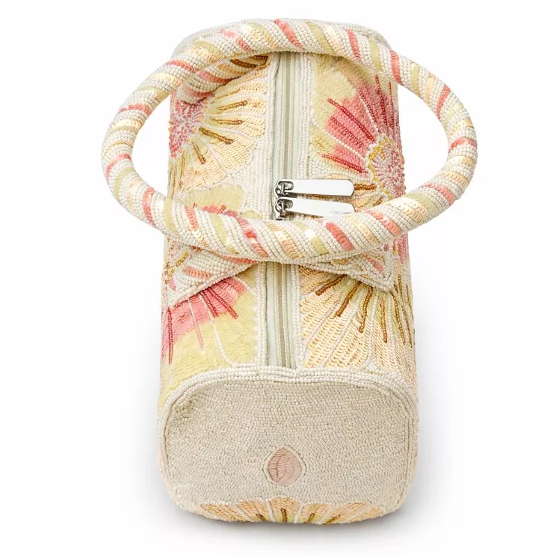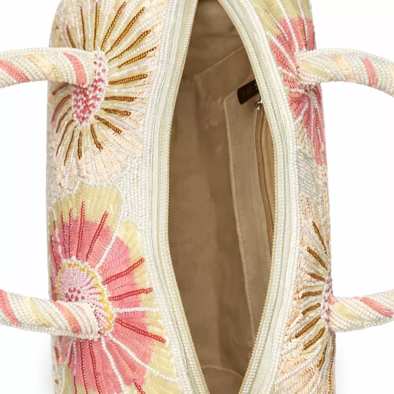 Crafted on a premium fabric base and detailed with heavy hand bead and sequin embroidery. Features dense handcrafted surface work with large floral motifs and fine detailing. Finished with a smooth inner lining, a secure top zipper closure, and beaded wrapped top handles for a refined, sturdy carry.